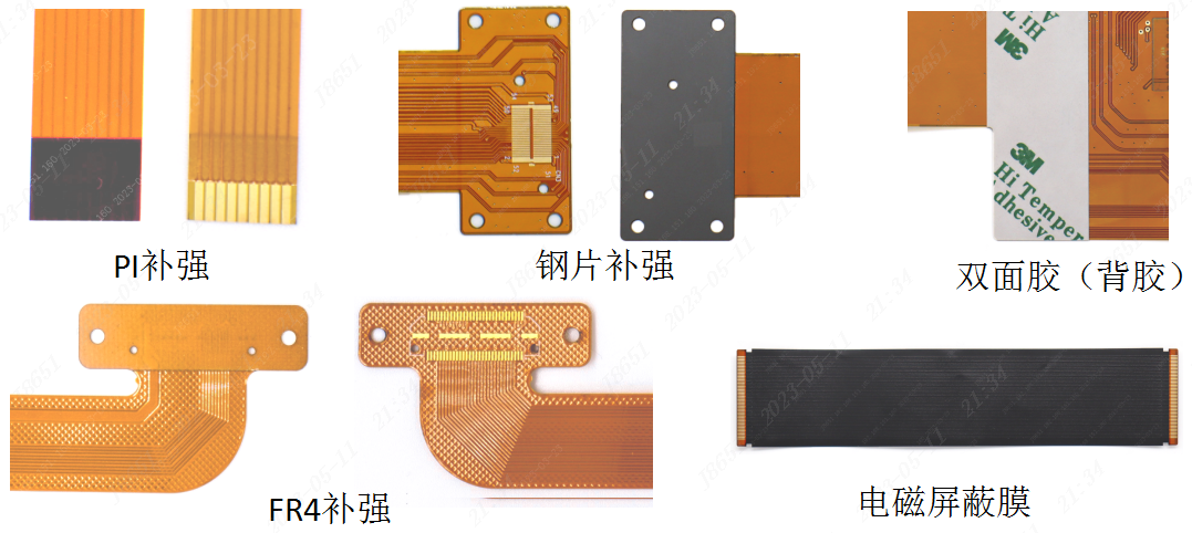 ④ 补强是指在FPC局部区域增加钢性材料,方便组装。PI补强适用于金手指插拨产品; FR4适用于比较低端产品;钢片价格比较高,但是平整度好,不会变形,适用于需要芯片贴片的产品。补强板和电磁屏蔽膜是FPC制作可选项,依客户需要制作的。对于需要制作补强板的,可以在不同的区域做不同材料、不同厚度的补强板。(如下附图为常用的几种补强类型)