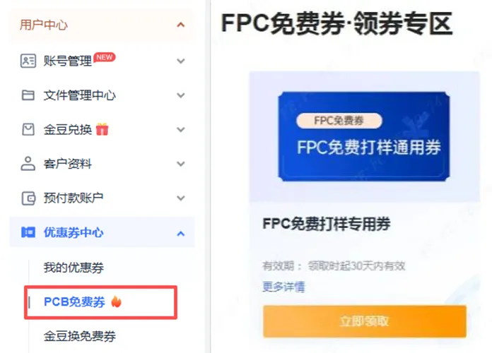 2、登录嘉立创下单助手,点击左侧导航菜单【优惠券中心】领取;