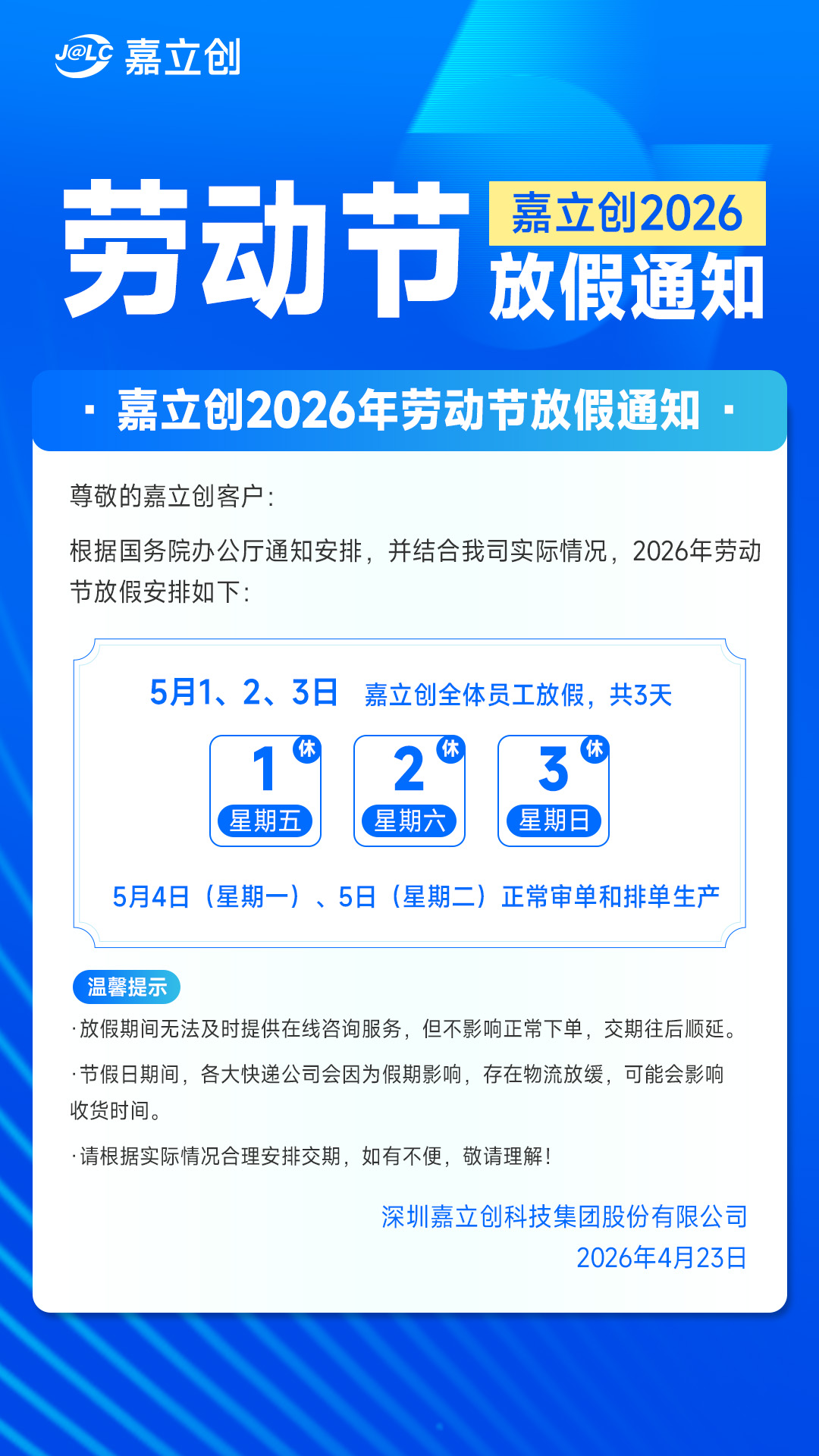 嘉立创FPC 2026五一劳动节放假通知
