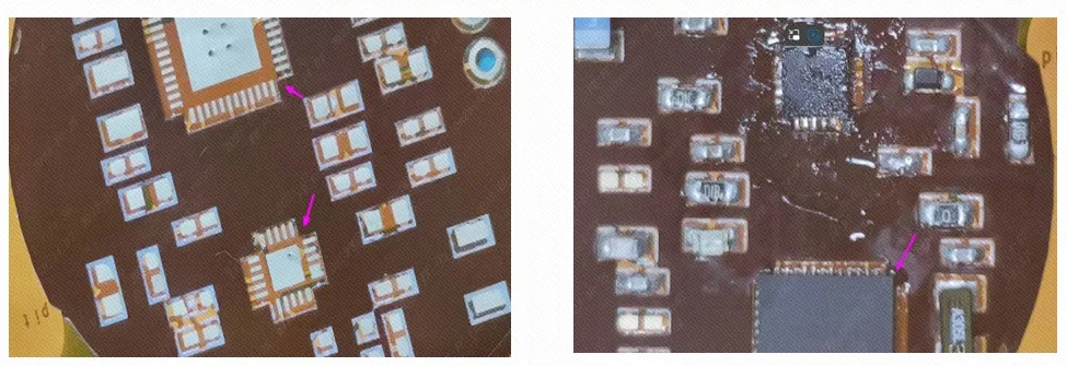 建议:芯片中间区域两组引脚之间不能有背胶或者其他补强