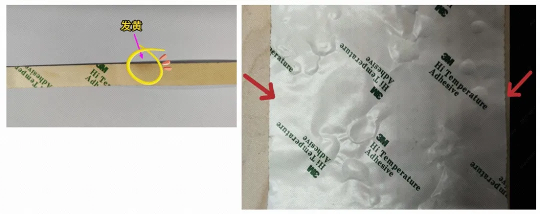 案例2️⃣:3M胶面积太大且贴背胶后再SMT,板子过高温后产生起泡、收缩、发黄的情况