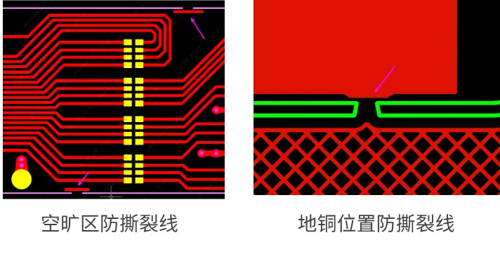 防撕裂线是指在连接点处对应的线路层增加一条小铜线,通过强化连接点区域强度,可有效预防手动分板时FPC的撕坏风险。如果空间允许的话,建议双面外层线路都添加防撕裂线。